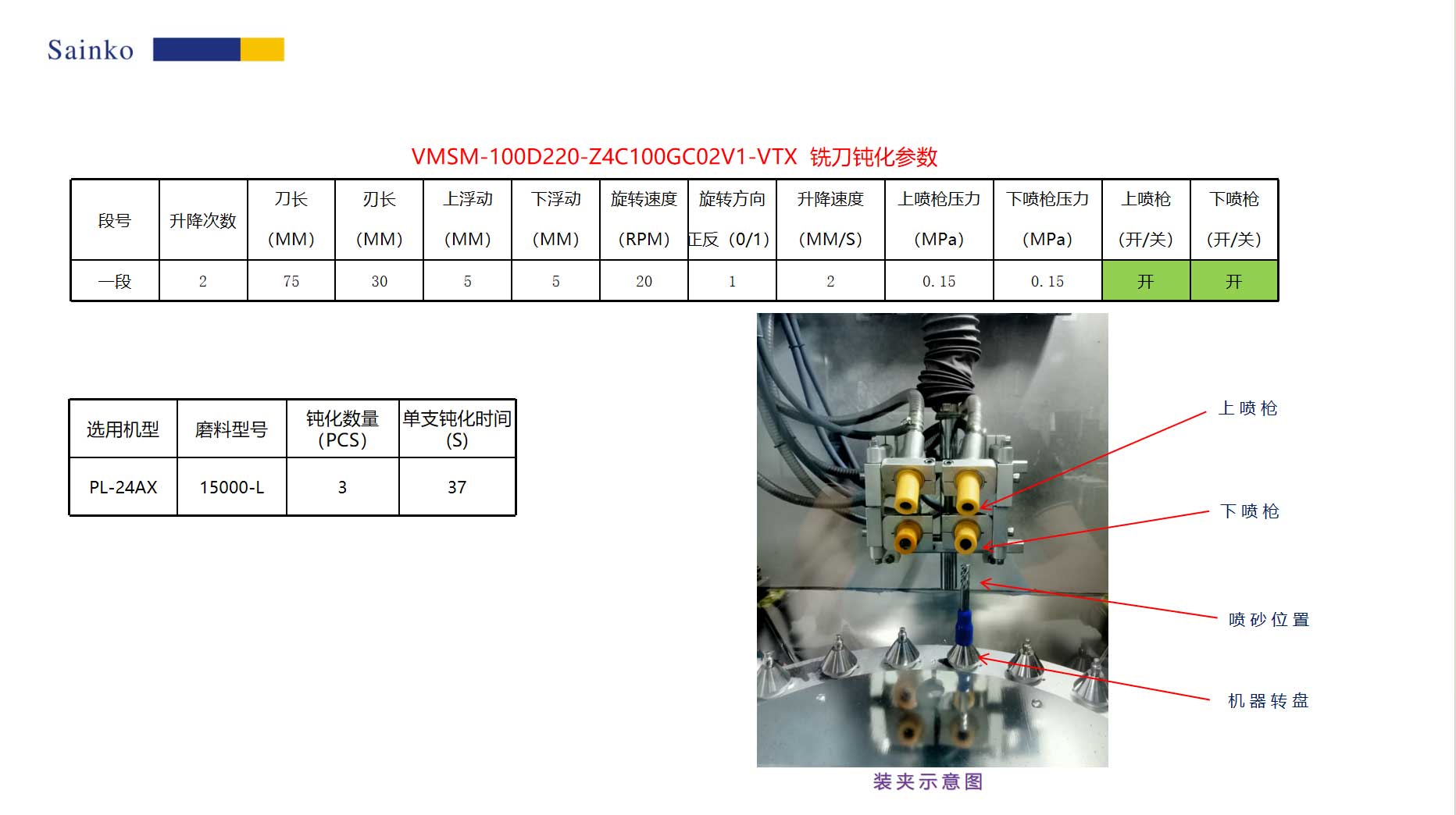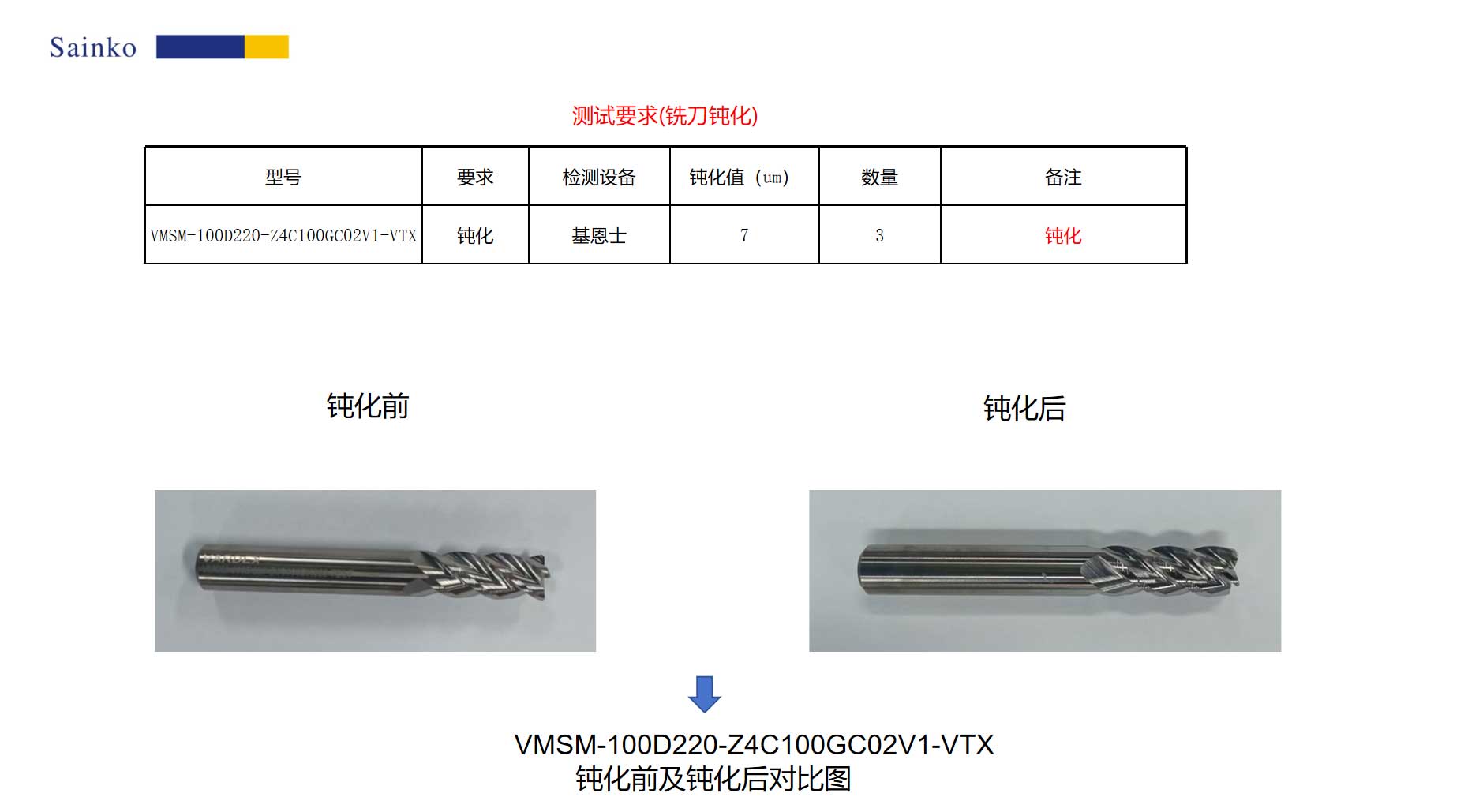 本次測試樣品為客戶提供的銑刀,型號為VMSM-100D220-Z4C100GC02V1-VTX,共計(jì) 3 件,核心需求為銑刀鈍化處理,且明確鈍化值需達(dá)到 7μm 標(biāo)準(zhǔn)。為精準(zhǔn)滿足需求,我司采用PL-24AX鈍化設(shè)備,并搭配15000-L型號磨料開展加工:通過設(shè)備對鈍化轉(zhuǎn)速、壓力等參數(shù)的精準(zhǔn)調(diào)控,結(jié)合磨料的精細(xì)研磨作用,終 3 件銑刀的鈍化值均穩(wěn)定達(dá)到 7μm 預(yù)設(shè)要求,同時(shí)消除了刃口原始存在的鋸齒與毛刺。經(jīng)后續(xù)驗(yàn)證,鈍化后的銑刀在切削加工過程中,不僅能顯著提高加工產(chǎn)品的表面質(zhì)量,還優(yōu)化了切屑排出效果,有效減少切屑堆積、劃傷工件的問題,具體測試結(jié)果詳見本報(bào)告。