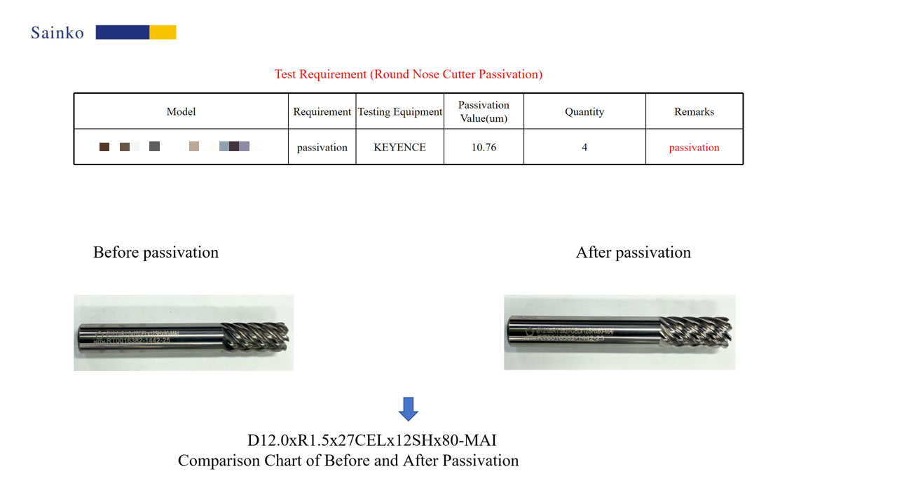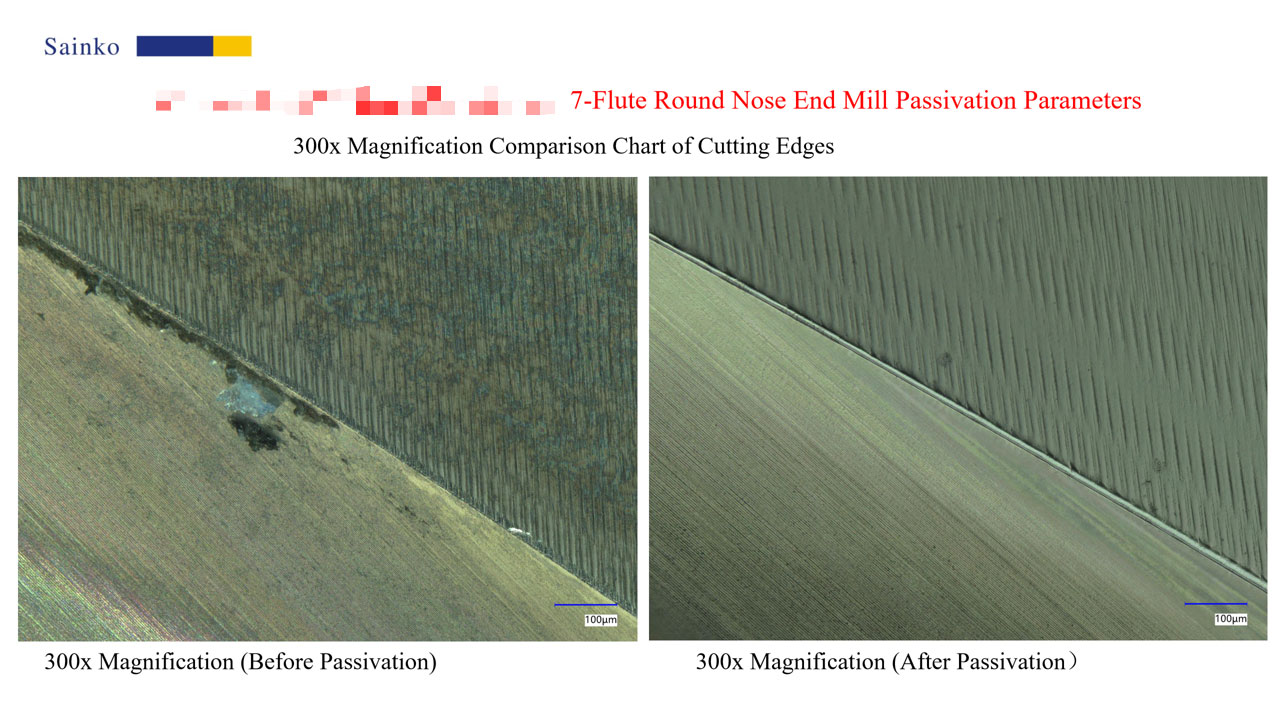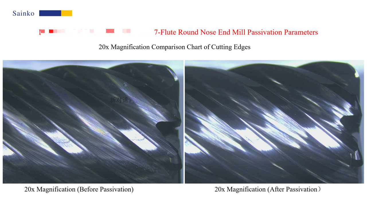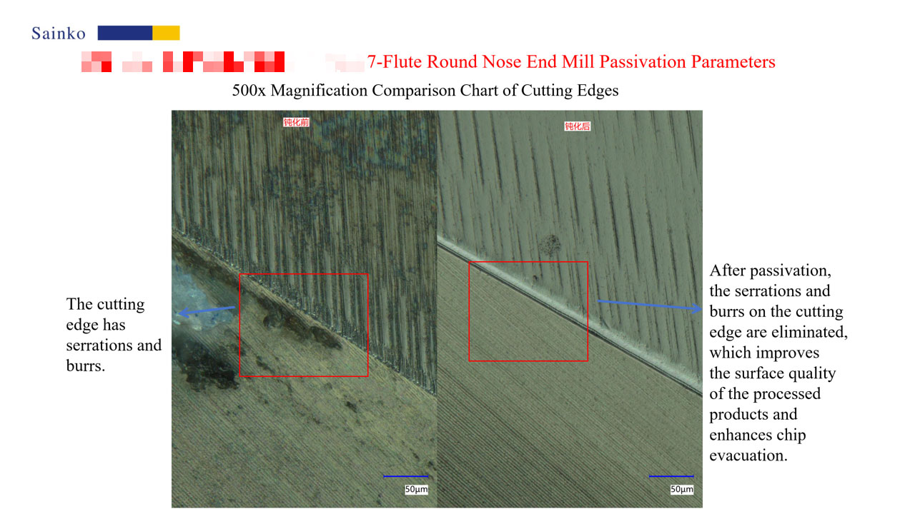 In this passivation test on 7-flute corner radius end mills, the PL-24AX machine and 15000-L abrasive were used, with a processing time of 20 seconds per tool. A total of 4 tools were passivated. Observations under a 500x microscope showed that serrations and burrs on the cutting edges were largely eliminated after passivation, which can effectively improve the surface quality of machined parts and chip evacuation performance. Measurements at 1000x magnification confirmed that the post-passivation R value stably reached 10.76μm, meeting the preset target and verifying the effectiveness and reliability of the passivation process.